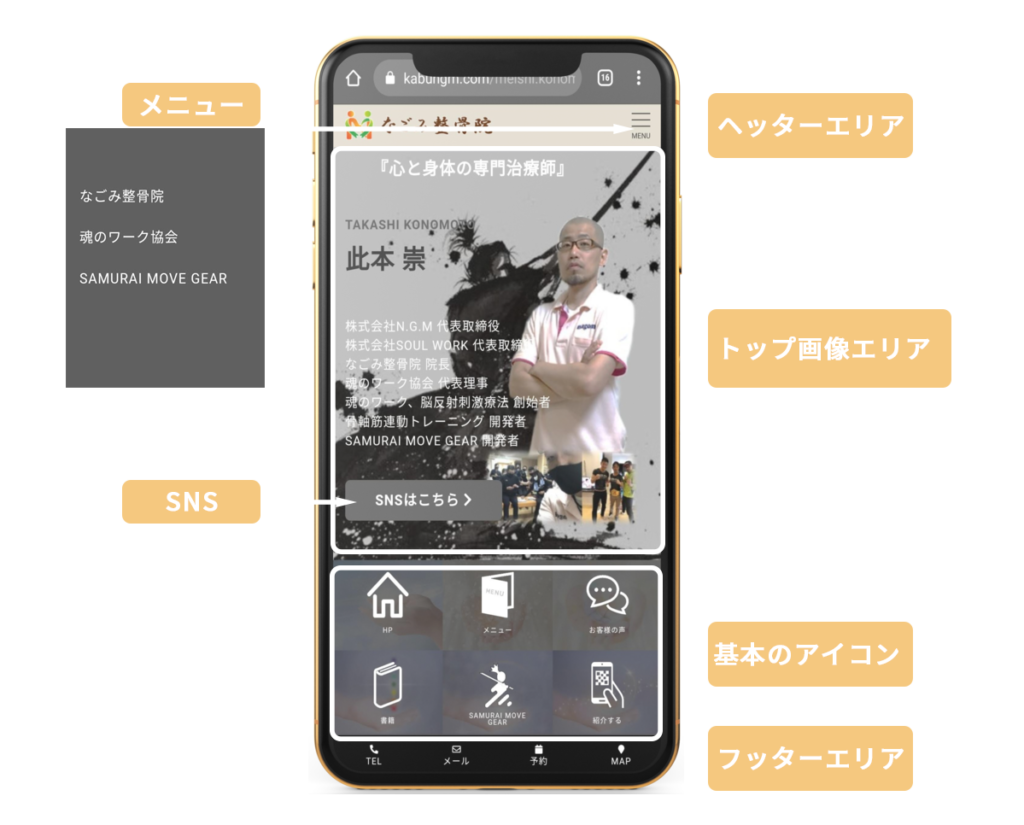 例)背景にするお店の写真と自分の写真 - アイコンを6個とそれに紐ずくURLや情報